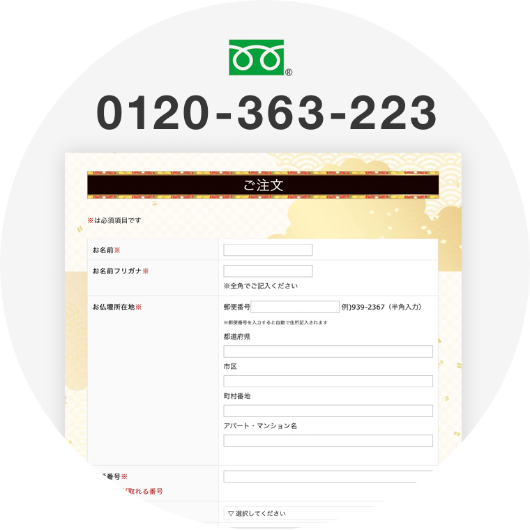 まずは「オーダーフォーム」に必要事項を明記の上、お申し込みください。または電話0120-363-223までご連絡ください。お電話でのお申し込みは仏壇サイズなど必要事項をこちらより質問いたします。